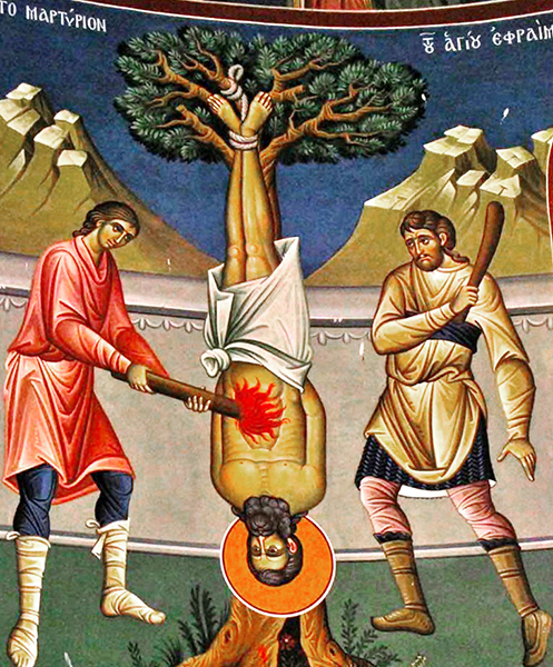 في العام 1424م وفد إلى الدير جنود عثمانيون فاقتحموه وقتلوا كلّ الرهبان الذين كانوا فيه وسرقوا كلّ المثمّنات التي طالتها أيديهم. أفرام، يوم ذاك، كان خارج الدير. فلما عاد وشهد الخراب وما حلّ بالرهبان، حزن بعمقٍ لكنّه لم يشأ أن يغادر المكان مهما كلّف الأمر. وكان أن عاد العثمانيون في 14 أيلول سنة 1425م إلى الدير. أفرام، هذه المرّة كان موجودًا، فأُخذ أسيرًا وعُذّب تعذيبًا رهيبًا. فترة تعذيبه امتدّت ثمانية أشهر ونصف الشهر. وقد تمّت شهادته في 18 أيار من العام 1426م، الساعة التاسعة صباحًا وكان اليوم ثلاثاء. كان قد بلغ الثانية والأربعين من العمر. قيّدوه إلى شجرة توت لا تزال إلى اليوم. جعلوا رجليه إلى فوق ورأسه إلى تحت، وقد سمّروا رأسه ورجليه وجرّحوه بالكامل وأشبعوه ضربًا وطعنوه في أحشائه بخشبة مسنّنة تتّقد فصارت أحشاؤه تحترق. وقد أمعنوا في جسده تنكيلاً حتى بعدما لفظ نفسه الأخير. هكذا استكمل شهيد المسيح شهادته. ووري الثرى في باحة الدير، وقد بقي أكثر من خمسمئة عام لا يدري بأمر شهادته أحد إلى أن شاءت النعمة الإلهية أن يخرج ذكره إلى العلن معزيًّا للمؤمنين ومشدّدًا ومعينًا. يوم اكتشفت الراهبة عظام القدّيس وأخذت تستخرجها من الأرض، أمطرت الدنيا وأوحلت الأرض فتعذّر عليها إتمام عملها فجعلت العظام كما هي في كوّة فوق القبر، وغادرت على أن تعود في الغد لإتمام ما شرعت فيه. |