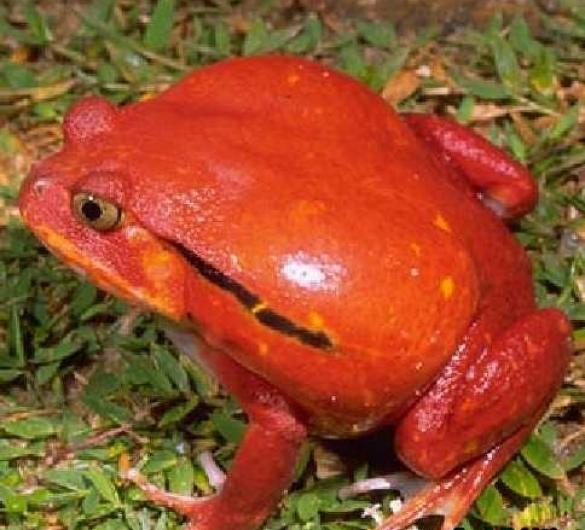 ضفدع الطماطم tomato frogs سمي بهذا الاسم طبعا للونه وحجمه وشكله المكورالموطن : في مدغشقر ويقتصر على جزء من شمال غرب الجزيرة , وتسكن الغابات وعندما أزيلت منها الغابات تكيفت مع المعيشة في المناطق المزروعة وتوجد في الحدائق والمزارع