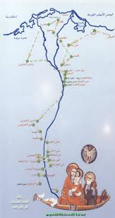 خط سير الرحلة: http://www.coptictamgeed.com/P-HolyFamily-EG.jpg مجئ السيد المسيح إلى ارض مصر من بيت لحم إلى الفرما التابعة للعريش ومنها إلى بسطة (بالقرب من الزقازيق) ومنها إلى المحمة (مسطرد) ثم إلى بلبيس ومنها إلى منية جناح التى يقرب بمنود ثم إلى البرلس ثم إلى بلاد السباخ (سخا الحالية تابعة لكفر الشيخ) وهناك وضع يده على حجر فسمى هذا المكان (بينى ايسوس) اى (كعب يسوع) ويدعى الان دير المغطس.. ثم إلى وادى النطرون ثم إلى عين شمس.. (المطرية) حيث الشجرة المباركة.. ثم قصدوا فسطاط مصر (مصر القديمة) حيث اختبأوا في مغارة (هى بكنيسة ابى سرجة الان) حيث توجهوا إلى الصعيد وعلى الشاطئ بارك الله الصخرة العالية وهى الان معروفة باسم (سيدة الكف) (بجبل الطير – شرق سمالوط حاليا).. ومن هناك مضوا إلى الاشمونين ثم أستانفوا المسير من الجبل الشرقى إلى الغرب حيث وصلوا الى جبل قسقام المعروف الان بدير السيدة العذراء (المحرق) حيث أقاموا هناك ستة أشهر. طقس العيد (24 بشنس): له ابصاليات (واطس وآدام) مدونتان بكتاب الابصاليات الواطس والادام وذكصولوجيات المناسبات، وله ربع من أرباع الناقوس وذكصولوجية خاصة بكتاب الابصلمودية السنوية (اقرأ ذكصولوجية مجيئ المسيح إلى أرض مصر في بموقع الأنبا تكلاهيمانوت بقسم التسبحة المكتوبة). |