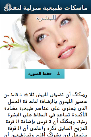 اقوى ماسكات تفتيح البشرة https://lh4.ggpht.com/RaJuUzsJfb-Ln6...gmbqlM=h900-rw تطبيق يحتوى على العديد من الماسكات والخلطات الطبيعية للعناية بالبشرة بجميع أنواعها،ماسكات البشرة الدهنية، ماسكات البشرة الجافة، ماسكات البشرة العادية، ماسكات البشرة المختلطة، للعديد من الأغراض مثل خلطات تنظيف البشرة، خلطات تبيض وتفتيح البشرة، وأيضا للتخلص من مشاكل البشرة لتكون جاهزة لوضع المكياج على بشرتك مثل البثور الرؤوس السوداء، جفاف البشرة، التخلص من حب الشباب وغيرها. شاهدى وصفات طبيعية مجربة لجمال بشرتك من هنا ووصفات طبيعية مختلفة لجمال و حيويه الشعر من هنا وللعناية بالاظافر واحدث الرسومات من هنا و للعناية بالقدمين من هنا توجى جماك باحدث الاكسسوارات من هنا تعلمى وضع المكياج كالمحترفين من هنا |