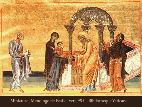 أيقونة دخول السيّد إلى الهيكل أيقونة دخول السيّد إلى الهيكل تُتَرجم ببساطتها ما كتبه الإنجيلي لوقا في الإصحاح الثاني من إنجيله. عناصرها الأساسيّة ثابتة وهي : - الطفل يسوع. - العذراء مريم والدة الإله. - يوسف خطيب مريم. - سمعان الشيخ. - حنّة النبيّة. - المذبح الذي يعلوه قبة قائمة على أربعة عواميد. القبّة ترمز إلى الرّب الضابط الكلّ والعواميد الأربعة إلى الإنجيليين الأربعة. ولكن طبعًا هناك مدارس عدة في كتابة الأيقونة (نقول الأيقونة تُكتب ولا تُرسم) فقد نشاهد تنوّعًا في ألوان الثياب، وتمايزًا في خلفيّة الأشخاص والمذبح والهيكل. كذلك نرى في بعض الأيقونات الرّب يسوع في يدي العذراء مريم وسمعان الشيخ ينتظر اللقاء، وفي أيقونات أخرى نشاهد يسوع محمولاً على ذراعي سمعان الشيخ إمّا يشير إلى العذراء وإمّا يبارك سمعان، وقد تم اللقاء. وقد تختلف وضعيّة الأشخاص في الأيقونة وتوزيعهم. وعلى الرغم من هذا التنوع يبقى الحدث الأساسي دائمًا في الوسط: الرّب يسوع وخلفه العذراء مريم أمّ النور، ويقابلهما سمعان الشيخ نفسه. وجه يسوع بالغٌ دائمًا وهذا يشير إلى ألوهيته بمعنى أنه كان موجودًا قبل أن يتجسّد. في هذه الأيقونة مثلًا ، نشاهد: 1- سمعان الشيخ يحمل الطفل بوقار واحترام: ما أجمل هذا اللقاء: سمعان الشيخ، القديم الأيام يلتقي الله الظاهر بالجسد. الشيخ يحتضن الإله طفلاً، سائلاً الله أن يطلقه، ليصير طفلاً في ملكوته. 2- الطفل يسوع يُشير بيده إلى العذراء مريم لأنها والدة الإله: فهذه هي أمّه وأمّ البشريّة جمعاء. 3- مريم تنحني إزاء الحدث الإلهي وترفع يديها قبولاً لمشيئة الله، وهي تُصغي لكلام سمعان الشيخ: فهو يبشّرها بالصليب والقيامة معًا، وهي تضع كلّ شيء في قلبها بنور البشارة والنعمة الإلهيّة. 4- لباس والدة الإله من الخارج داكنٌ إشارةً إلى المجد الإلهي والصبر والجهاد الحسن من دون كللٍ ولا ملل. 5- حنة النبيّة تقف خلف العذراء، تنظر إلى يوسف، وتشير بيدها إلى يسوع علامةً لتحقيق النبؤة. 6- لباس حنّة أخضر، رمزًا للحياة الجديدة بالرّب يسوع. 7- الراية في اليد اليسرى لحنة النبيّة مدوّن عليها: هذا الصبي ثبّت السماء والأرض، به كوّن كلّ شيء ومن دونه لم يكن شيء. 8- القدّيس يوسف يحمل حمامتين كعادة اليهود للذبيحة والتطهير كما ترمزان أيضًا إلى طبيعتَي يسوع الإلهية والبشرية وإلى العهدَين القديم والجديد. ![]() |