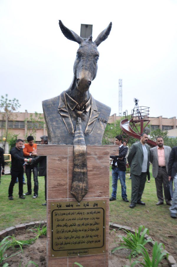 إنتسبوا إلى حزب الحمير...حزب طريف جداً باب العضوية مفتوح والرفسة هي أحد الشروط الأساسية لطالبي العضويةهذه دعوة من أبو الحمير عمر كلول الأمين العام لجمعية حمير كردستان والتي تأسست عام 1993 ثم تحولت إلى حزب سياسي عام 2005 بعد 12 سنة من النهيق والرفس، وفق وصف الأمين العام. وقد اجتذبت الجمعية بضعة آلاف من الأنصار والمؤيدين بما فيهم أعضاء من مصر. وشعار الجمعية هو "بسبب قسوة الإنسان قررنا أن نعيش كالحمير". وللحزب أو الجميعة تشكيل إداري وهيكلي، فالمكتب السياسي للحزب يسمى "الخان" وهو مكان نوم الحمير وفق اللغة الكردية، بينما تسمى المكاتب الفرعية "الاسطبل". كما تتوزع درجات ومراتب أعضاء الحزب وفق درجات معينة منها "حمار وأتان وجحش" والأمين العام للحزب يسمى أبو الحمير. ويطالب الحزب حكومة إقليم كردستان بدعمه ماليا لفتح إذاعة تحمل اسم "النهيق". ومعلوم أن وصف شخص في دول الشرق الأوسط بالحمار تعتبر مهانة ووصفاً بالغباء. ويدافع كلول بأن الحمار هو الحيوان الوحيد الذي يعمل ويتعب ويشقى ويتحمل ويبقى صامتاً ولكنه محروم من جميع الحقوق مثل البشر. وقد قام أبو الحمير حديثاً بتدشين نصب برونزي لرأس حمار يلبس بدلة وبربطة عنق في شارع نالي في السليمانية وقد حضر حفل الإفتتاح عدد من الفنانين ومشاهير كردستان. ويذكر أنه في منتصف القرن الماضي تأسس في أوروبا "نادي الحمير" الذي رأسه "فرانسوا بيل"، وكان أعضاء النادي ذوو مكانة اجتماعية مرموقة ولبعضهم وزن في الحياة السياسية والاقتصادية، ونظرا لمكانة هذا النادي وأهدافه الاجتماعية الترفيهية فقد افتتح له فروعا في دول عربية منها في مصر ولبنان وسورية. صور للأمين العام ![]() |