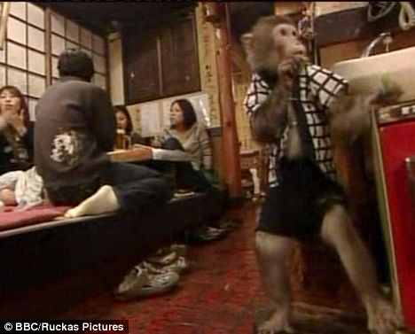 في حركة غير مسبوقة قام مطعم (Kayabukiya Tavern) في شمال طوكيو في اليابان الشهير بتقديم طبق الساكي الياباني بتوظيف إثنين من القرده في تقديم الطعام والطلبات للزبائن داخل المطعم. القردان من فصيله قرود (macaque) اليابانيه والذين أطلق عليهما أسماء Yat-chan و Fuku-chan ألبسا لباس التقديم الرسمي للمطعم وتم تدريبهما لخدمه طاولات معينه على حسب ما يطلب منهما من مطبخ المطعم.