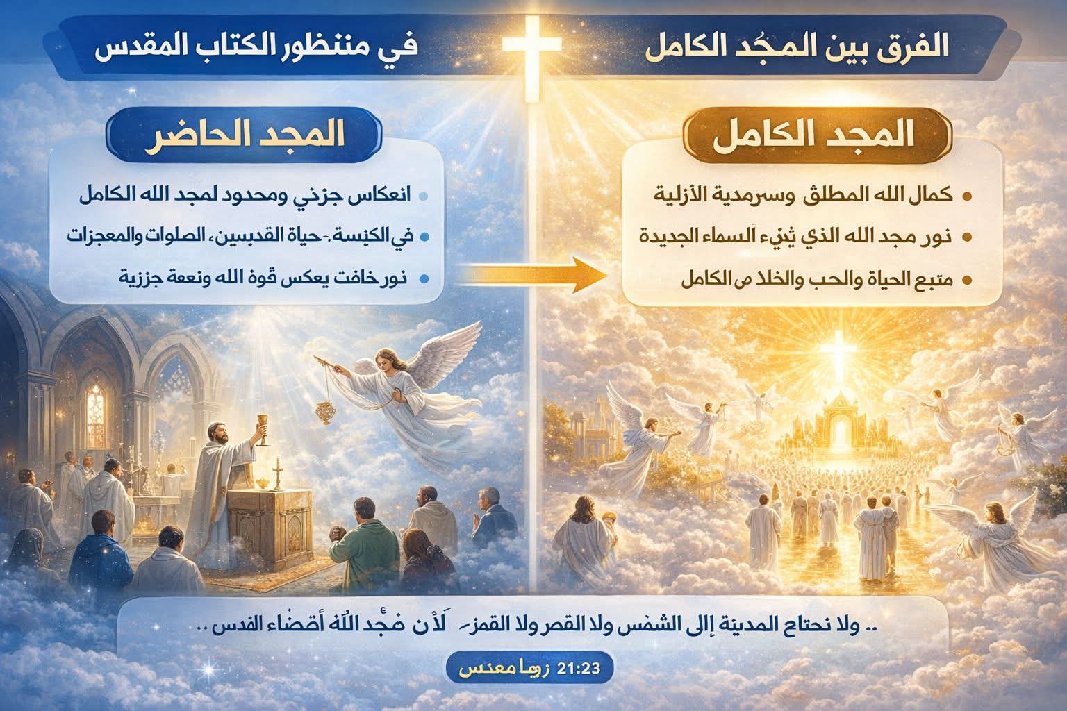 في سفر الرؤيا، كلمة "المجد" (Glory) غالبًا تشير إلى ظهور الله كما هو في كماله، أو عظمته الكاملة، أو سموه المقدس الذي يعكس كماله الإلهي. مثال: في رؤيا 21:23 – "ولا تحتاج مدينة إلى شمس ولا قمر لأن مجد الله أضاءها" → هنا المجد الكامل = نور الله بذاته، حضور الله الكامل والمطلق. المجد الكامل هو حضور الله في مجده الأزلّي الذي لا نقص فيه، وهو مصدر الحياة والنور والحقيقة. خلاصة: الكامل = كمال الله المطلق، الذي يظهر في السماء الجديدة والأرض الجديدة، ويُعطي البركة والقداسة الكاملة. 2️⃣ المجد الحاضر الآن المجد الحاضر هو جزء من هذا المجد الكامل يُكشف أو يُعاش بشكل محدود في الزمن الحالي، بسبب القيود البشرية والخطيئة. مثال: في الرؤيا، المؤمنون على الأرض يمكن أن يشهدوا نعمة الله أو قوته أو رحمته، لكن لا يستطيعون إدراك المجد الكامل كما في الملكوت السماوي. بعبارة أخرى: المجد الحاضر = انعكاس جزئي أو انعكاس محدود من المجد الكامل، يُرى في صلواتنا، المعجزات، أو في الكنيسة وفي حياة القديسين. 📌 مثال توضيحي بالكتاب: رؤيا 4:8-11: الكائنات الحية الأربع تقدّم "مجدًا" لله → هذا مجد حاضر يظهر للملائكة، لكنه جزئي مقارنة بالمجد الكامل الذي يخص الله بذاته. رؤيا 21:23: المدينة السماوية تتلألأ بـ "مجد الله" → هذا هو المجد الكامل الذي لا يُخفى، مجد الله بذاته، ليس انعكاسًا أو صورة. ✅ الخلاصة: المجد الكامل = كمال الله المطلق الذي سيظهر في النهاية، السماوي والأزلي. المجد الحاضر = انعكاس محدود لهذا المجد على الأرض أو في حياة المؤمنين، يمكن أن يُحس ويُشاهد جزئيًا ولكن ليس بكماله الأزلّي." ![]() |