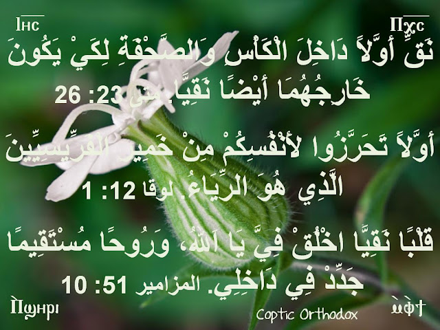 النقاء والطهارة الداخلية نَقِّ أَوَّلاً دَاخِلَ الْكَأْسِ وَالصَّحْفَةِ لِكَيْ يَكُونَ خَارِجُهُمَا أَيْضًا نَقِيًّا. متى 23: 26 تظاهر ورياء: وكان هذا مظهر عبادة وتدين الكتبة والفريسيين يظهرون خلاف ما يبطنون، أَوَّلاً تَحَرَّزُوا لأَنْفُسِكُمْ مِنْ خَمِيرِ الْفَرِّيسِيِّينَ الَّذِي هُوَ الرِّيَاءُ. لوقا 12: 1 طهارة ونقاء: وكانت وصية المسيح تعني نقاوة القلب أولاً من الداخل حتى يتنقى الخارج، قَلْبًا نَقِيًّا اخْلُقْ فِيَّ يَا اَللهُ، وَرُوحًا مُسْتَقِيمًا جَدِّدْ فِي دَاخِلِي. المزامير 51: 10 متى 23: 13 - 36 13 لكِنْ وَيْلٌ لَكُمْ أَيُّهَا الْكَتَبَةُ وَالْفَرِّيسِيُّونَ الْمُرَاؤُونَ! لأَنَّكُمْ تُغْلِقُونَ مَلَكُوتَ السَّمَاوَاتِ قُدَّامَ النَّاسِ، فَلاَ تَدْخُلُونَ أَنْتُمْ وَلاَ تَدَعُونَ الدَّاخِلِينَ يَدْخُلُونَ 14 وَيْلٌ لَكُمْ أَيُّهَا الْكَتَبَةُ وَالْفَرِّيسِيُّونَ الْمُرَاؤُونَ! لأَنَّكُمْ تَأْكُلُونَ بُيُوتَ الأَرَامِلِ، ولِعِلَّةٍ تُطِيلُونَ صَلَوَاتِكُمْ. لِذلِكَ تَأْخُذُونَ دَيْنُونَةً أَعْظَمَ 15 وَيْلٌ لَكُمْ أَيُّهَا الْكَتَبَةُ وَالْفَرِّيسِيُّونَ الْمُرَاؤُونَ! لأَنَّكُمْ تَطُوفُونَ الْبَحْرَ وَالْبَرَّ لِتَكْسَبُوا دَخِيلاً وَاحِدًا، وَمَتَى حَصَلَ تَصْنَعُونَهُ ابْنًا لِجَهَنَّمَ أَكْثَرَ مِنْكُمْ مُضَاعَفًا 16 وَيْلٌ لَكُمْ أَيُّهَا الْقَادَةُ الْعُمْيَانُ! الْقَائِلُونَ: مَنْ حَلَفَ بِالْهَيْكَلِ فَلَيْسَ بِشَيْءٍ، وَلكِنْ مَنْ حَلَفَ بِذَهَب الْهَيْكَلِ يَلْتَزِمُ 17 أَيُّهَا الْجُهَّالُ وَالْعُمْيَانُ! أَيُّمَا أَعْظَمُ: أَلذَّهَبُ أَمِ الْهَيْكَلُ الَّذِي يُقَدِّسُ الذَّهَبَ 18 وَمَنْ حَلَفَ بِالْمَذْبَحِ فَلَيْسَ بِشَيْءٍ، وَلكِنْ مَنْ حَلَفَ بِالْقُرْبَانِ الَّذِي عَلَيْهِ يَلْتَزِمُ 19 أَيُّهَا الْجُهَّالُ وَالْعُمْيَانُ! أَيُّمَا أَعْظَمُ: أَلْقُرْبَانُ أَمِ الْمَذْبَحُ الَّذِي يُقَدِّسُ الْقُرْبَانَ 20 فَإِنَّ مَنْ حَلَفَ بِالْمَذْبَحِ فَقَدْ حَلَفَ بِهِ وَبِكُلِّ مَا عَلَيْهِ 21 وَمَنْ حَلَفَ بِالْهَيْكَلِ فَقَدْ حَلَفَ بِهِ وَبِالسَّاكِنِ فِيهِ 22 وَمَنْ حَلَفَ بِالسَّمَاءِ فَقَدْ حَلَفَ بِعَرْشِ اللهِ وَبِالْجَالِسِ عَلَيْهِ 23 وَيْلٌ لَكُمْ أَيُّهَا الْكَتَبَةُ وَالْفَرِّيسِيُّونَ الْمُرَاؤُونَ! لأَنَّكُمْ تُعَشِّرُونَ النَّعْنَعَ وَالشِّبِثَّ وَالْكَمُّونَ، وَتَرَكْتُمْ أَثْقَلَ النَّامُوسِ: الْحَقَّ وَالرَّحْمَةَ وَالإِيمَانَ. كَانَ يَنْبَغِي أَنْ تَعْمَلُوا هذِهِ وَلاَ تَتْرُكُوا تِلْكَ 24 أَيُّهَا الْقَادَةُ الْعُمْيَانُ! الَّذِينَ يُصَفُّونَ عَنِ الْبَعُوضَةِ وَيَبْلَعُونَ الْجَمَلَ 25 وَيْلٌ لَكُمْ أَيُّهَا الْكَتَبَةُ وَالْفَرِّيسِيُّونَ الْمُرَاؤُونَ! لأَنَّكُمْ تُنَقُّونَ خَارِجَ الْكَأْسِ وَالصَّحْفَةِ، وَهُمَا مِنْ دَاخِل مَمْلُوآنِ اخْتِطَافًا وَدَعَارَةً 26 أَيُّهَا الْفَرِّيسِيُّ الأَعْمَى! نَقِّ أَوَّلاً دَاخِلَ الْكَأْسِ وَالصَّحْفَةِ لِكَيْ يَكُونَ خَارِجُهُمَا أَيْضًا نَقِيًّا 27 وَيْلٌ لَكُمْ أَيُّهَا الْكَتَبَةُ وَالْفَرِّيسِيُّونَ الْمُرَاؤُونَ! لأَنَّكُمْ تُشْبِهُونَ قُبُورًا مُبَيَّضَةً تَظْهَرُ مِنْ خَارِجٍ جَمِيلَةً، وَهِيَ مِنْ دَاخِل مَمْلُوءَةٌ عِظَامَ أَمْوَاتٍ وَكُلَّ نَجَاسَةٍ 28 هكَذَا أَنْتُمْ أَيْضًا: مِنْ خَارِجٍ تَظْهَرُونَ لِلنَّاسِ أَبْرَارًا، وَلكِنَّكُمْ مِنْ دَاخِل مَشْحُونُونَ رِيَاءً وَإِثْمًا 29 وَيْلٌ لَكُمْ أَيُّهَا الْكَتَبَةُ وَالْفَرِّيسِيُّونَ الْمُرَاؤُونَ! لأَنَّكُمْ تَبْنُونَ قُبُورَ الأَنْبِيَاءِ وَتُزَيِّنُونَ مَدَافِنَ الصِّدِّيقِينَ 30 وَتَقُولُونَ: لَوْ كُنَّا فِي أَيَّامِ آبَائِنَا لَمَا شَارَكْنَاهُمْ فِي دَمِ الأَنْبِيَاءِ 31 فَأَنْتُمْ تَشْهَدُونَ عَلَى أَنْفُسِكُمْ أَ